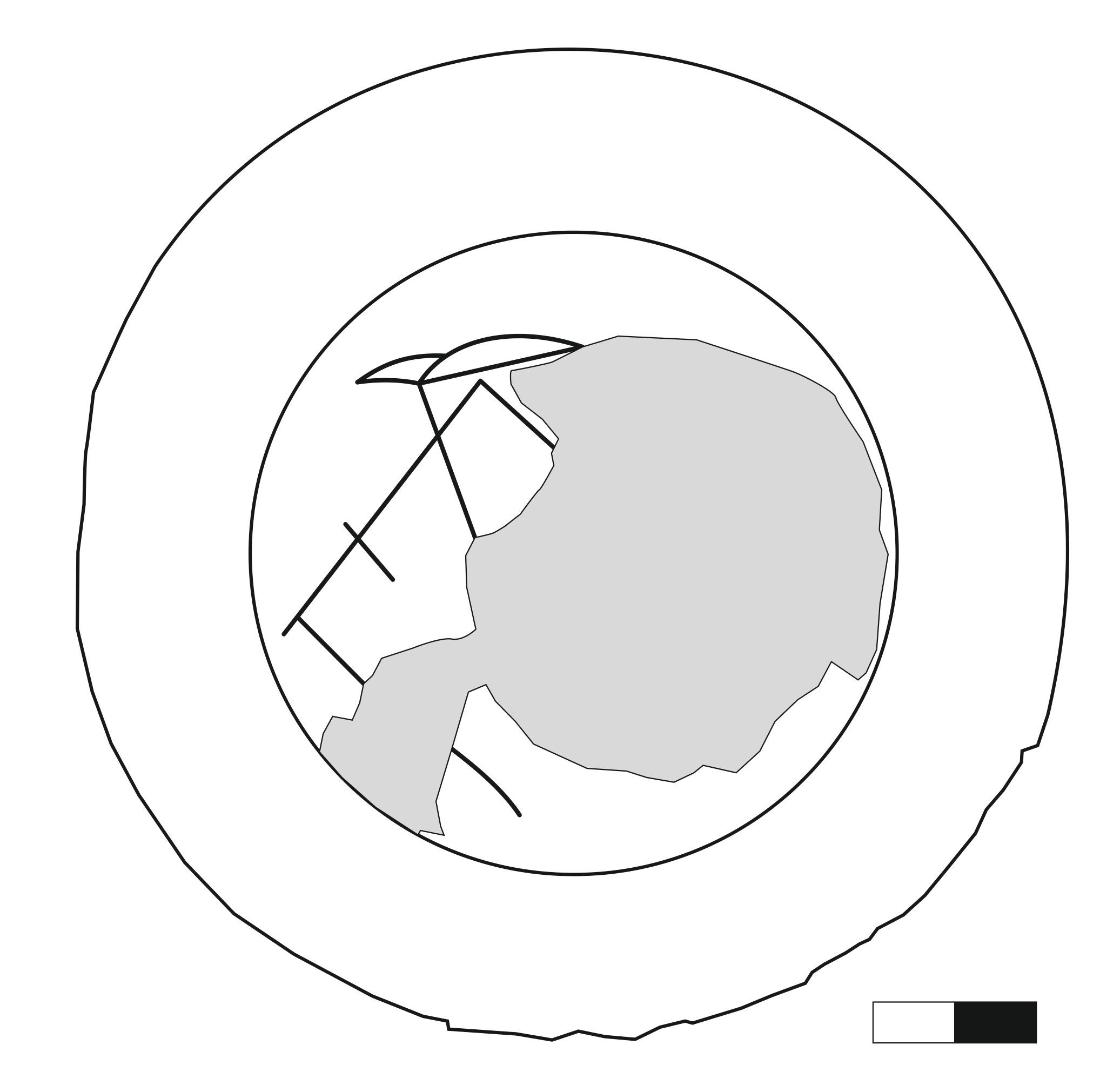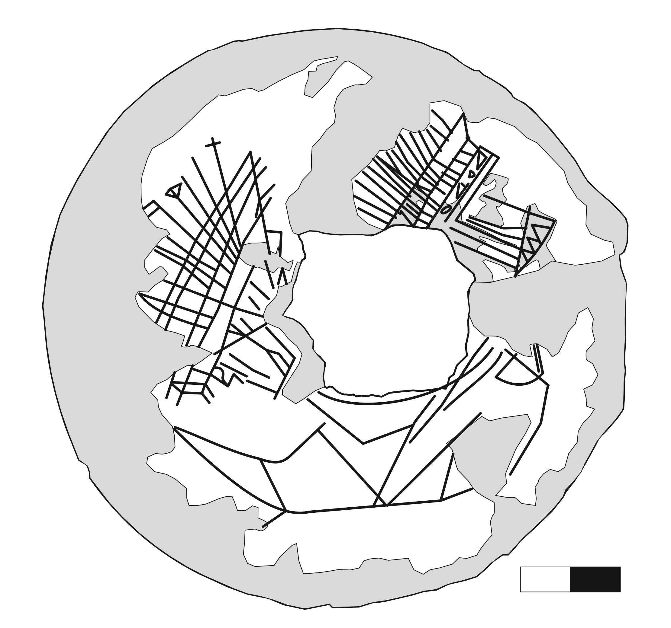 Drawings around the perimeter: two hulls of ships with many oars; one of these also has a sail. The other oared ship has some webbed matter on deck - also a sail or rigging? The third figure is probably also a ship's hull.