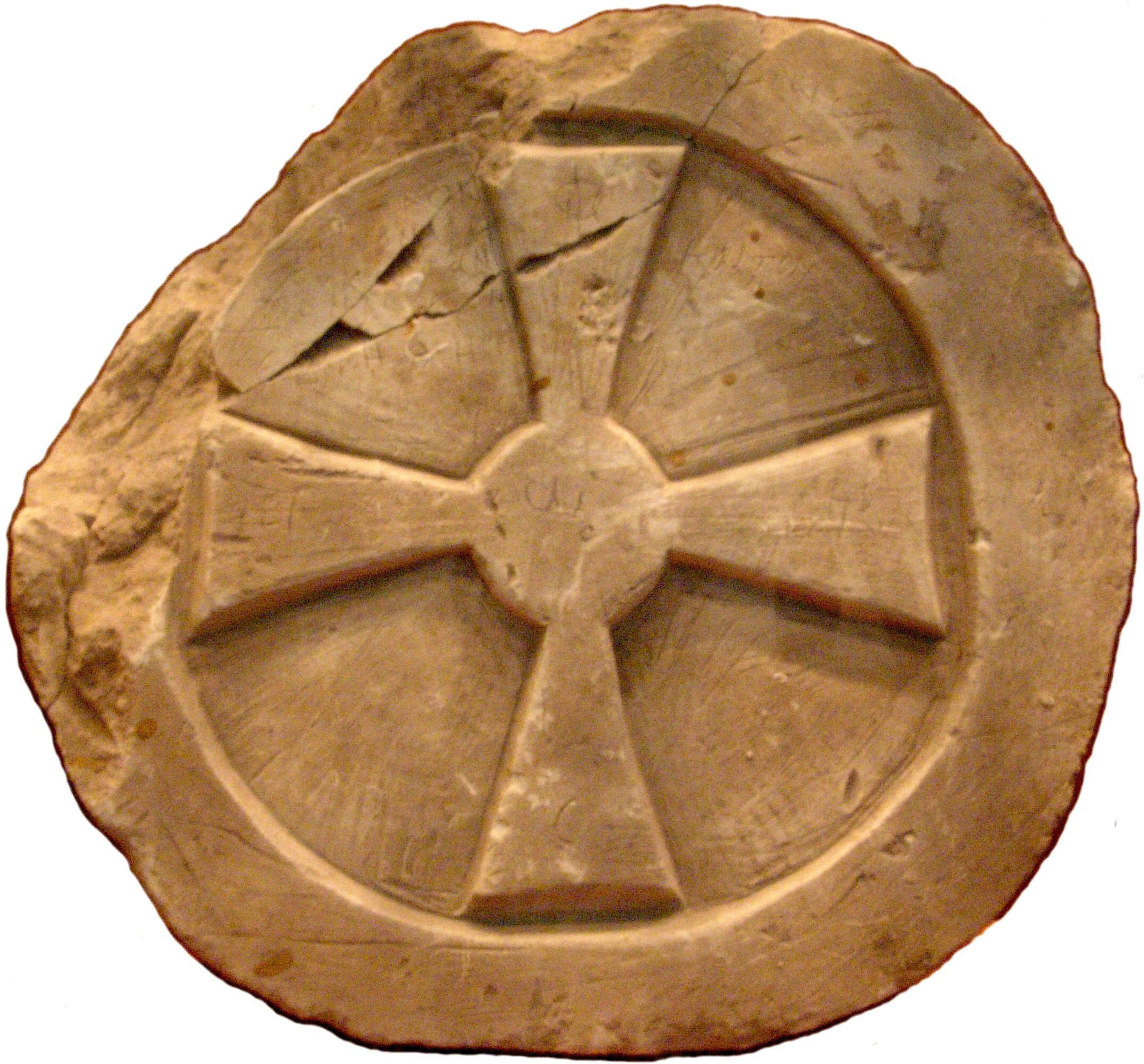 По периметру идет рельефная рамка (выс. — 0,5 см), внутри которой помещается рельефный крест с расширяющимися концами и кругом в центре. Сколота левая верхняя часть рамки.