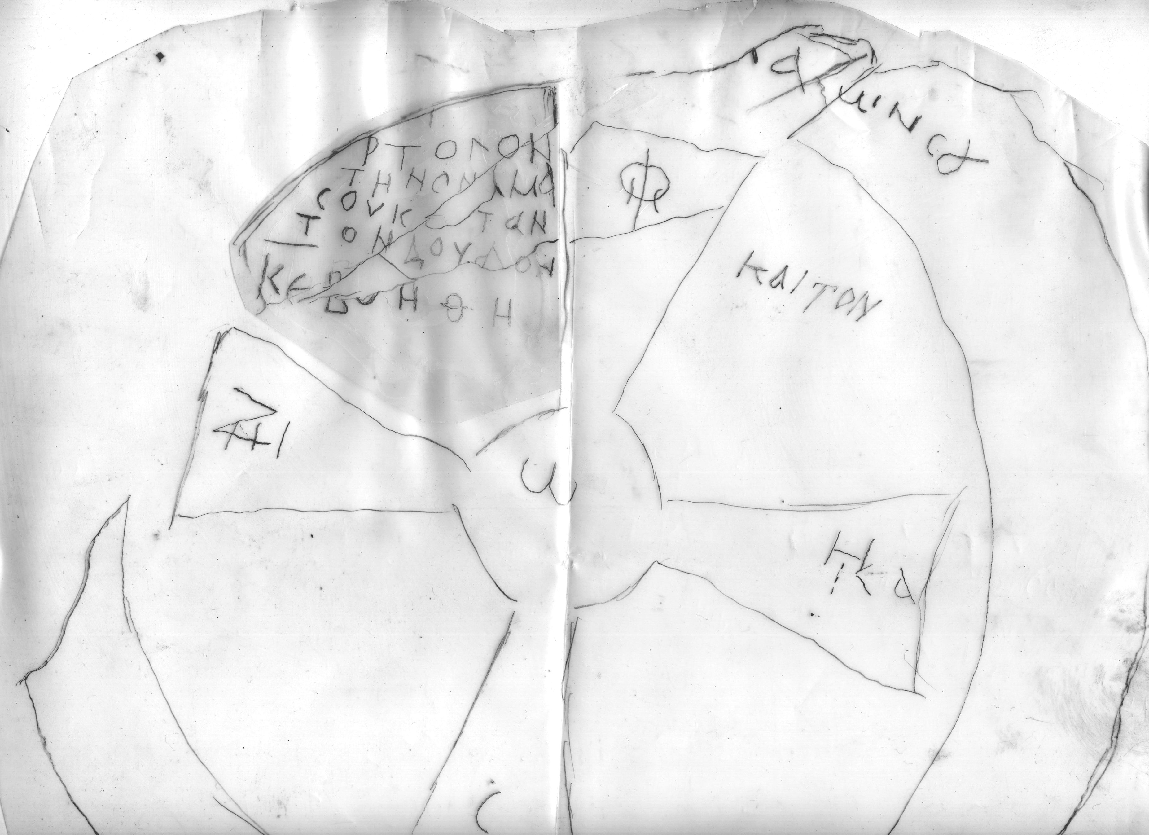 Камень, очевидно, предназначался для закладки в стену. Первоиздатель датировал надпись, как и всю базилику, 2 пол. VI в., однако ее палеография ясно указывает на средневизантийский период.